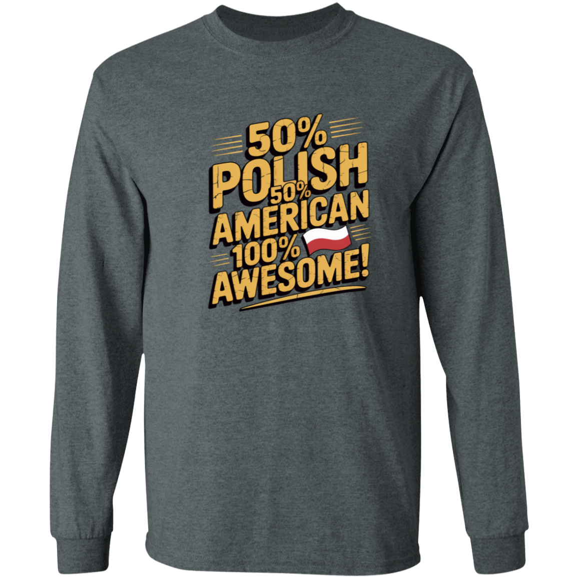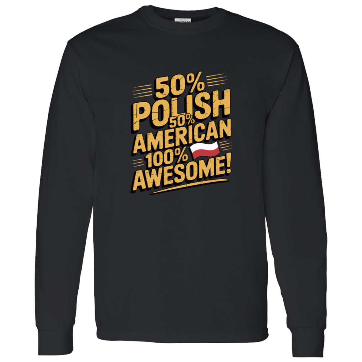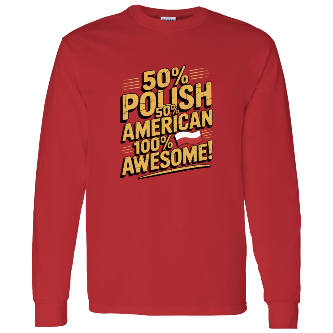Stay warm while showing your roots with the 50% Polish 50% American 100 Awesome Long Sleeve. A playful heritage shirt that’s great for cooler days, cultural gatherings, or casual outings.