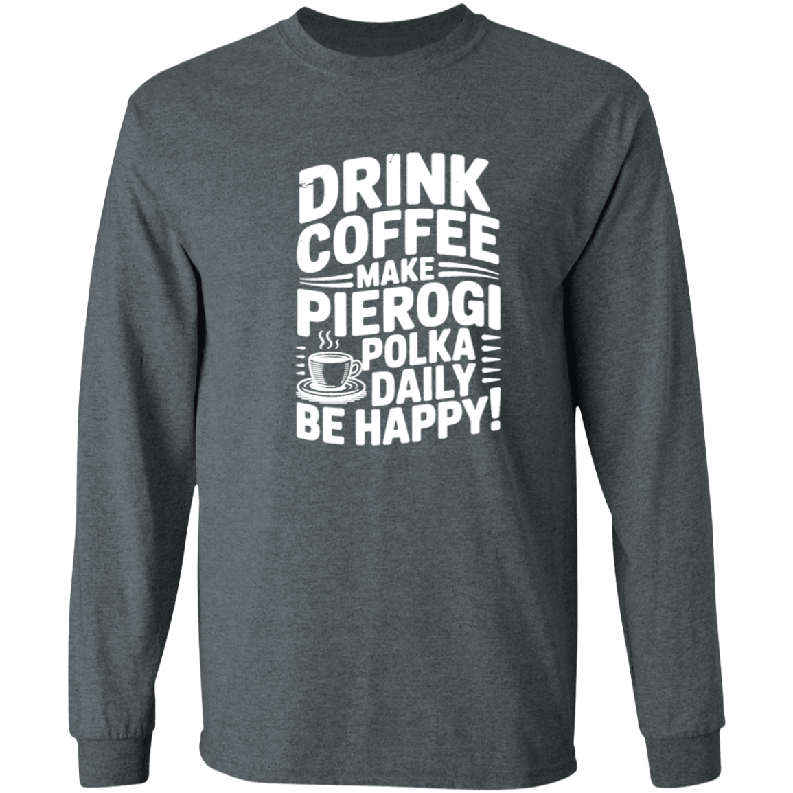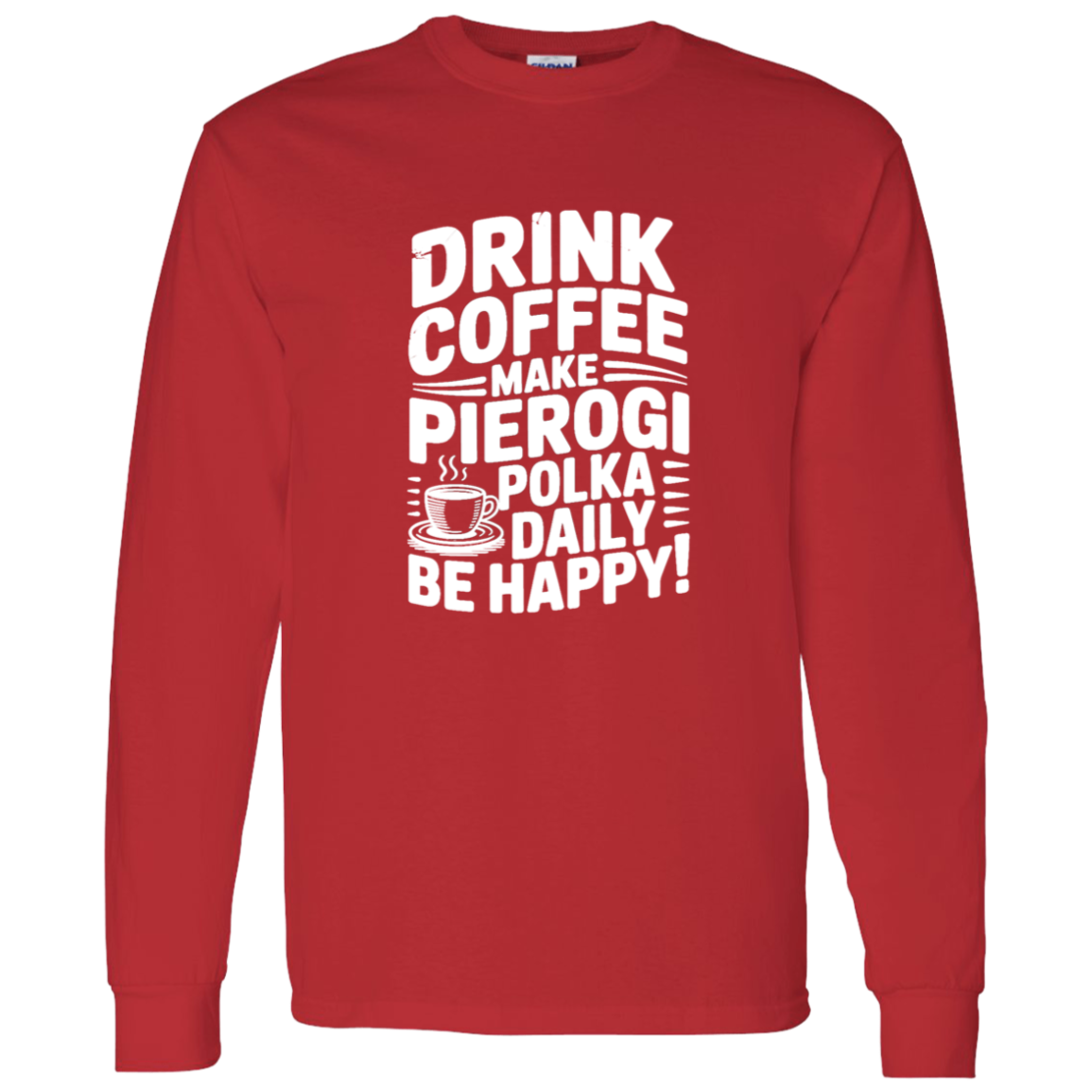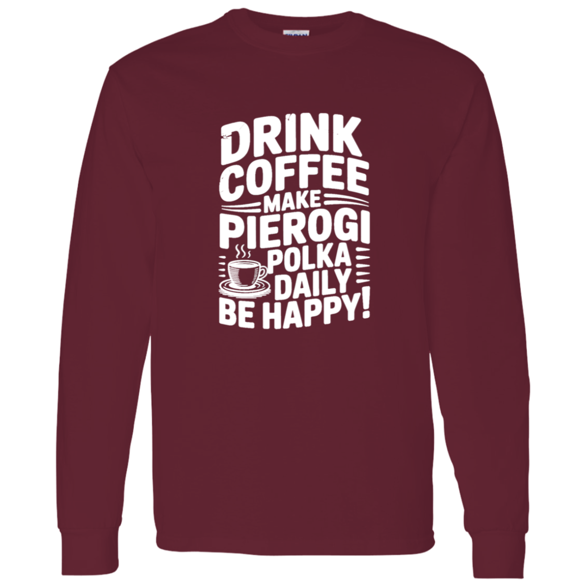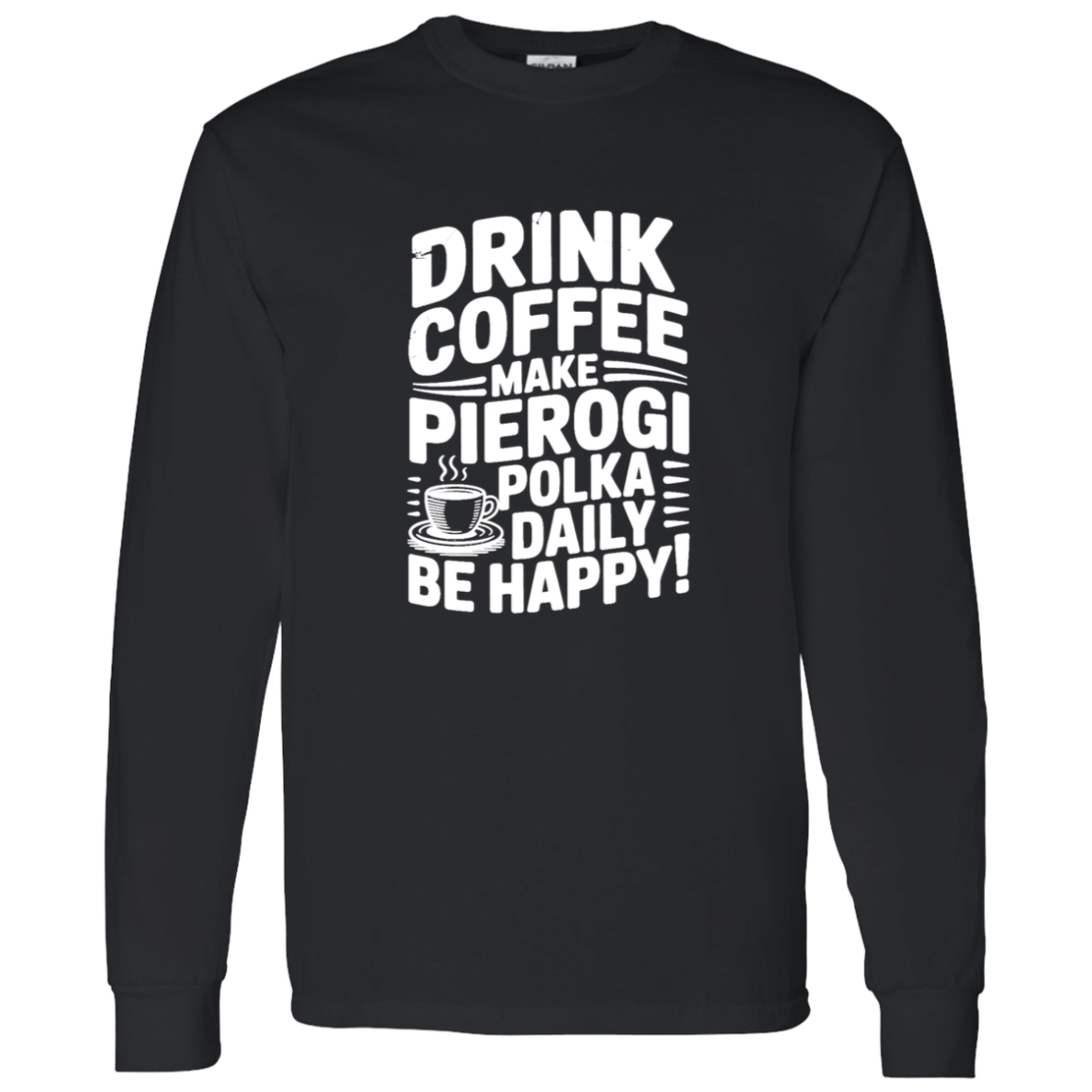 Brighten chilly days with the Drink Coffee Make Pierogi Polka Daily Live Happy Long Sleeve. Great for polka events, pierogi festivals, or celebrating Polish pride, this shirt mixes tradition and humor for a happy everyday style.