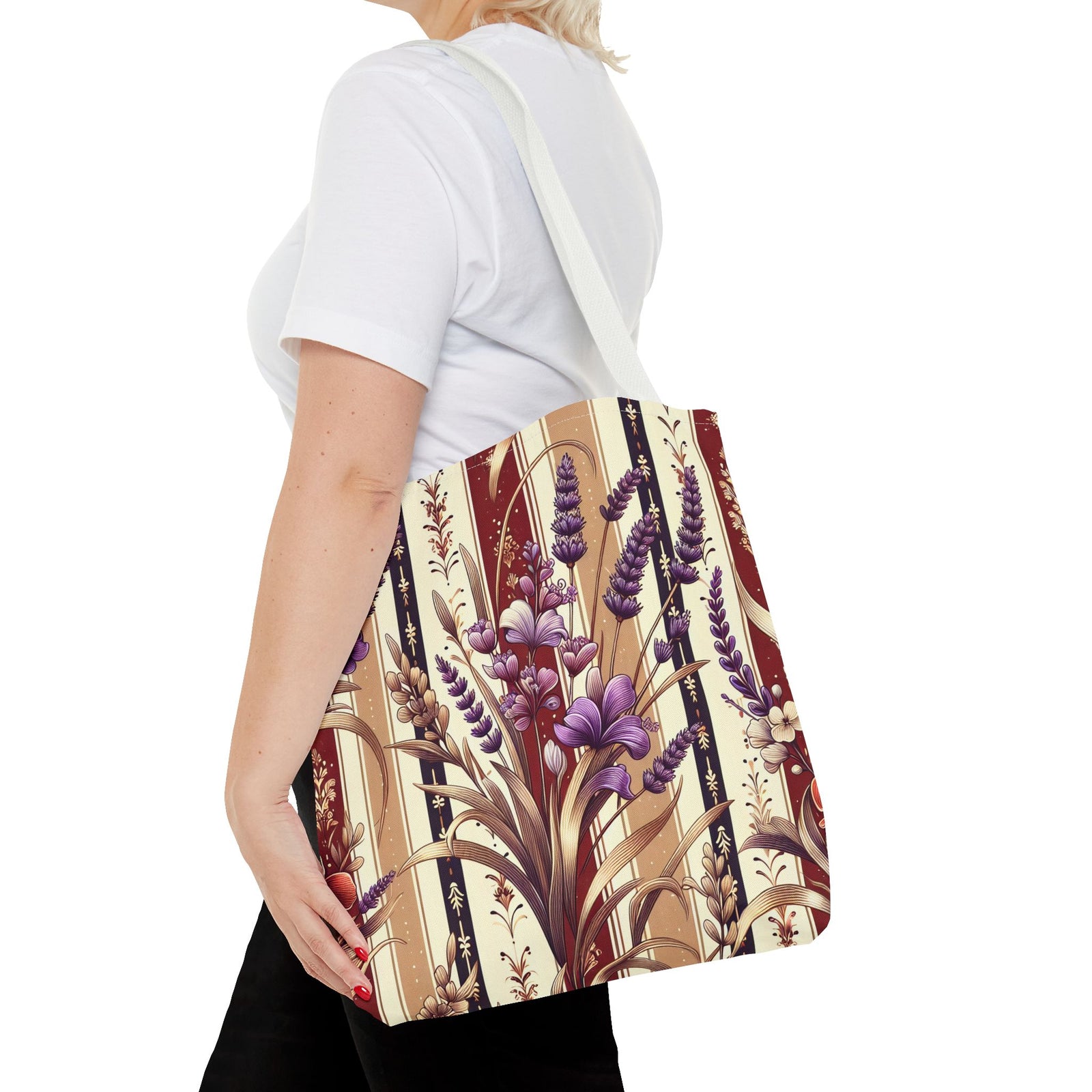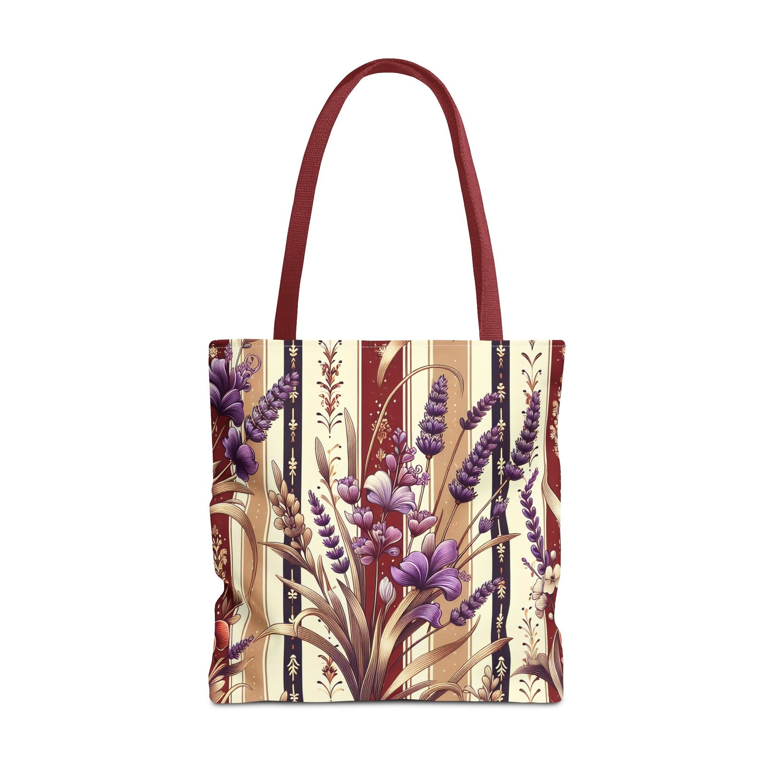 This Tote Bag features a seamless image with polish folk art wycinanki in a nostalgic pattern of dusty red and white stripes with soft illustrations of lavender, separated by slender gold lines. Perfect for those who appreciate traditional designs and want to add a touch of nostalgia to their everyday style. Ideal for carrying groceries, books, or other essentials. Relevant for Polish heritage celebrations and folk art enthusiasts. Product features - 100% Polyester body for strength and durability - Seamless thread color for a polished look - Reinforced stitching on handles for added strength - Boxed corners for extra room - Available in 3 sizes with 5 handle color options Care instructions - Remove all items from the bag before cleaning. Suggested to pretreat visible stains with stain remover. Mix warm water with laundry detergent and clean the bag with terry washcloth or a soft bristle brush. Let the bag air dry.