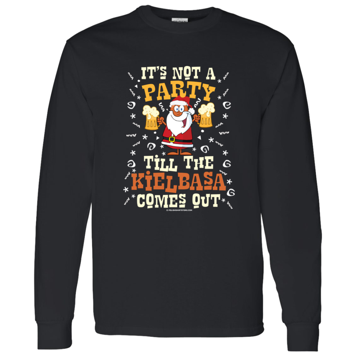 Bring the festive fun to your holiday gatherings with this playful long sleeve shirt. Featuring the cheeky “It’s Not A Party Till The Kielbasa Comes Out” Christmas version design, it’s perfect to wear while celebrating with family and friends. Stay cozy and spread holiday cheer in style with this unique and humorous shirt that adds a tasty twist to your Christmas party attire.