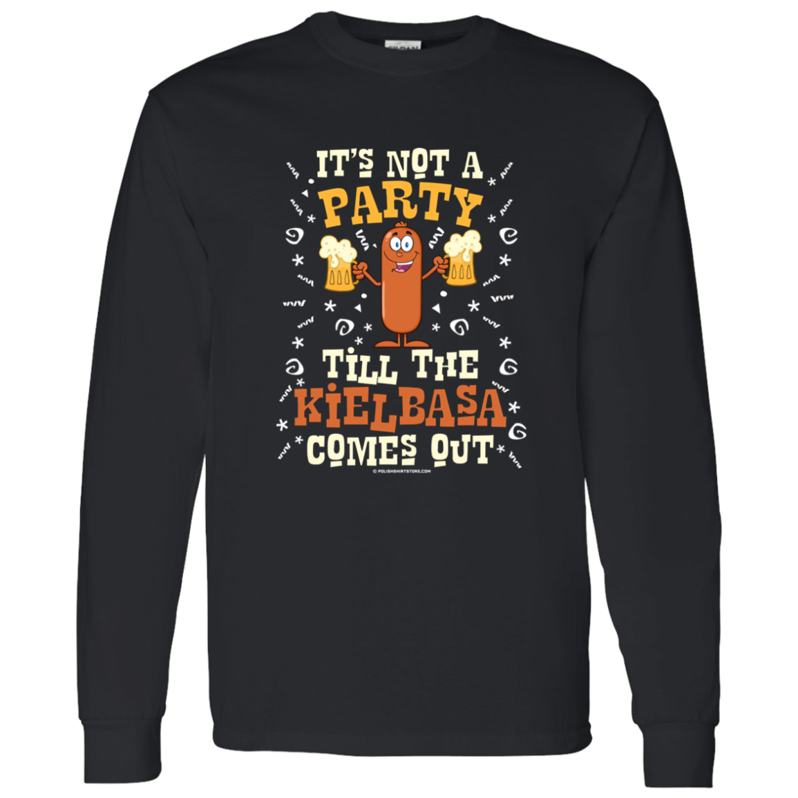Celebrate with style wearing the "Its Not A Party Till The Kielbasa Comes Out" long sleeve shirt. Perfect for lively gatherings, this playful tee brings a fun vibe and makes a bold statement. Soft and comfortable, it’s ideal for those who love to keep the party going. Whether grilling or hanging out, this long sleeve will be your go-to for a good time.