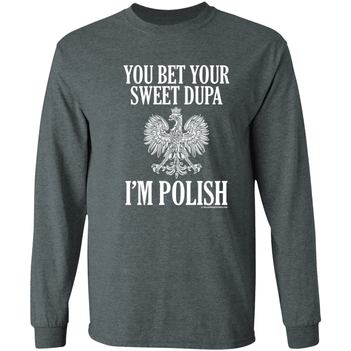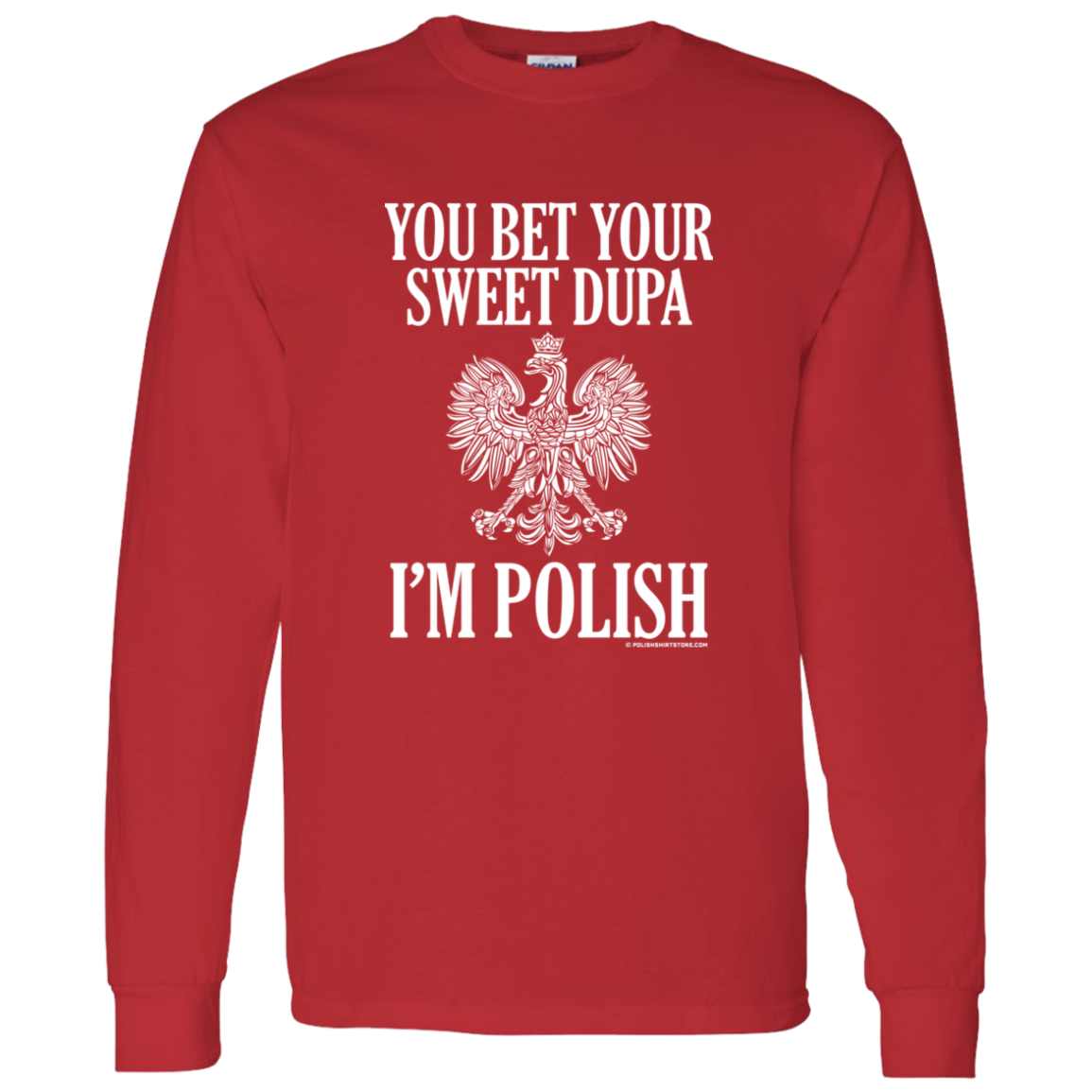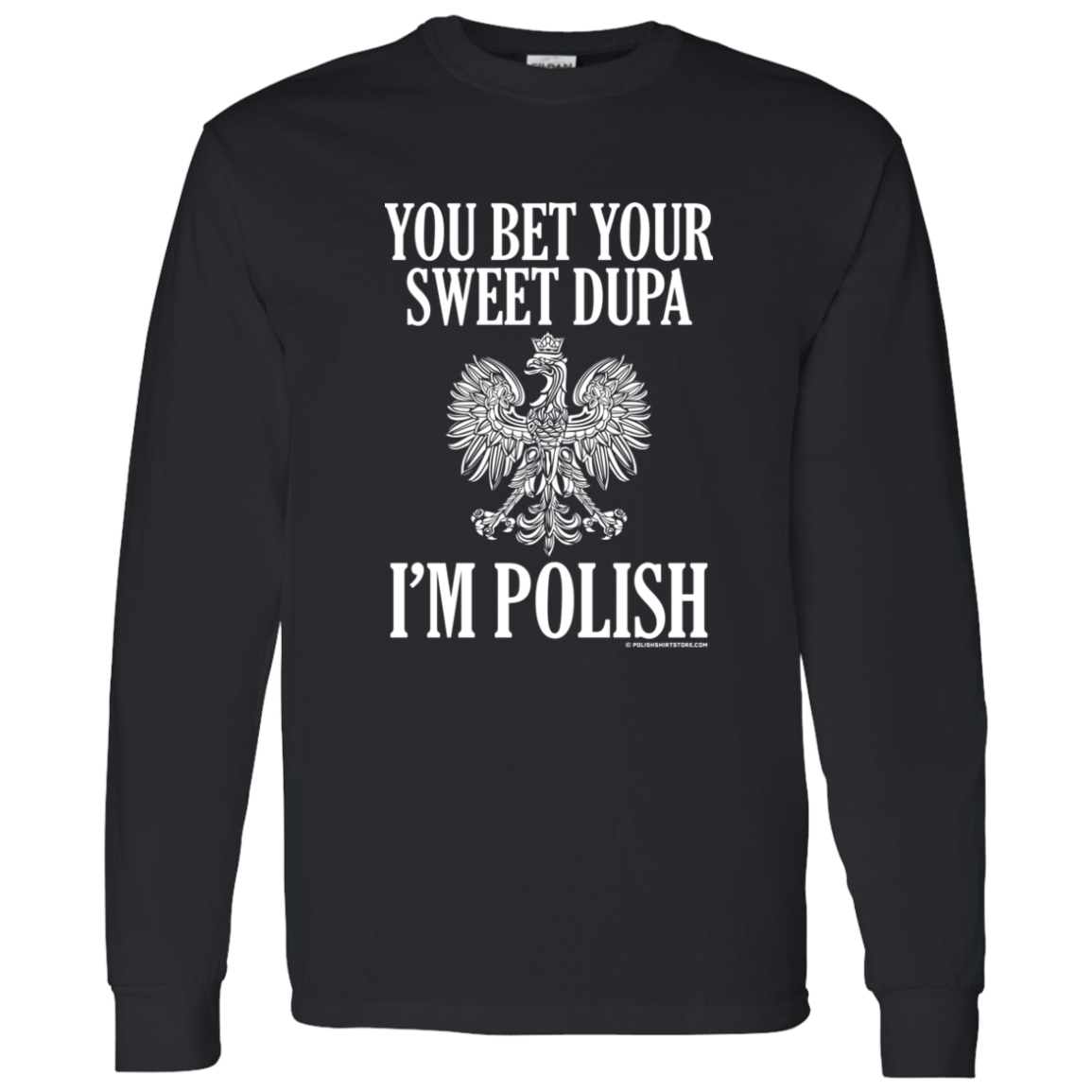 Show off your pride with a playful twist in the "You Bet Your Sweet Dupa I'm Polish" long sleeve shirt. Perfect for cooler days, this comfortable, long-sleeved tee combines bold humor with cultural flair, making it a fun and stylish choice for any casual occasion. Celebrate your heritage and keep cozy all at once!